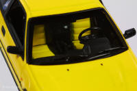 A Yellow 1988 CRX Si with a black/yellow interior and aftermarket black multispoke wheels.